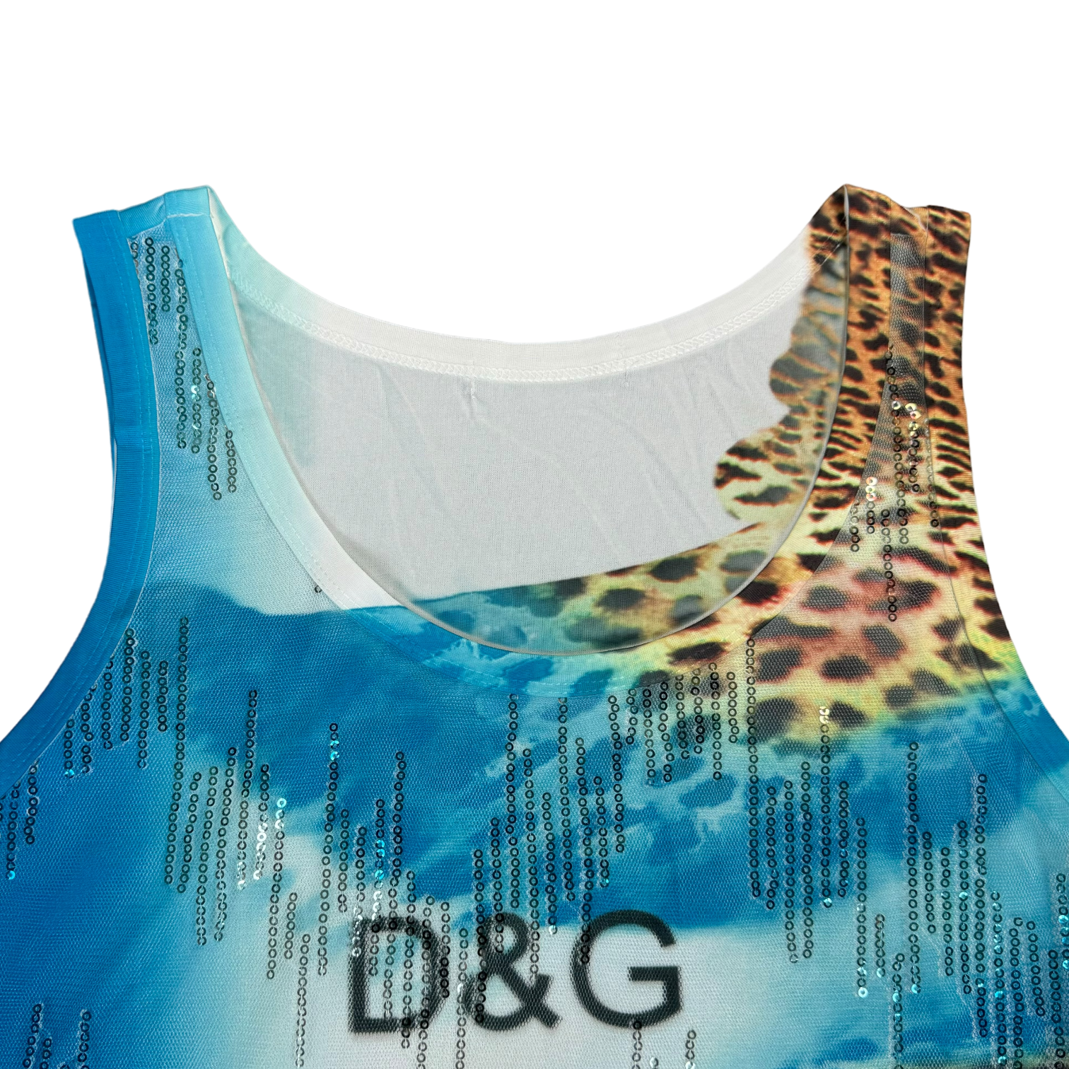 Dolce & Gabbana double layered top featuring a front mesh layer embellished with sequins and a back layer with a leopard printed on. Truly a beautiful piece perfectly showcasing the Dolce & Gabbana y2k supremacy.