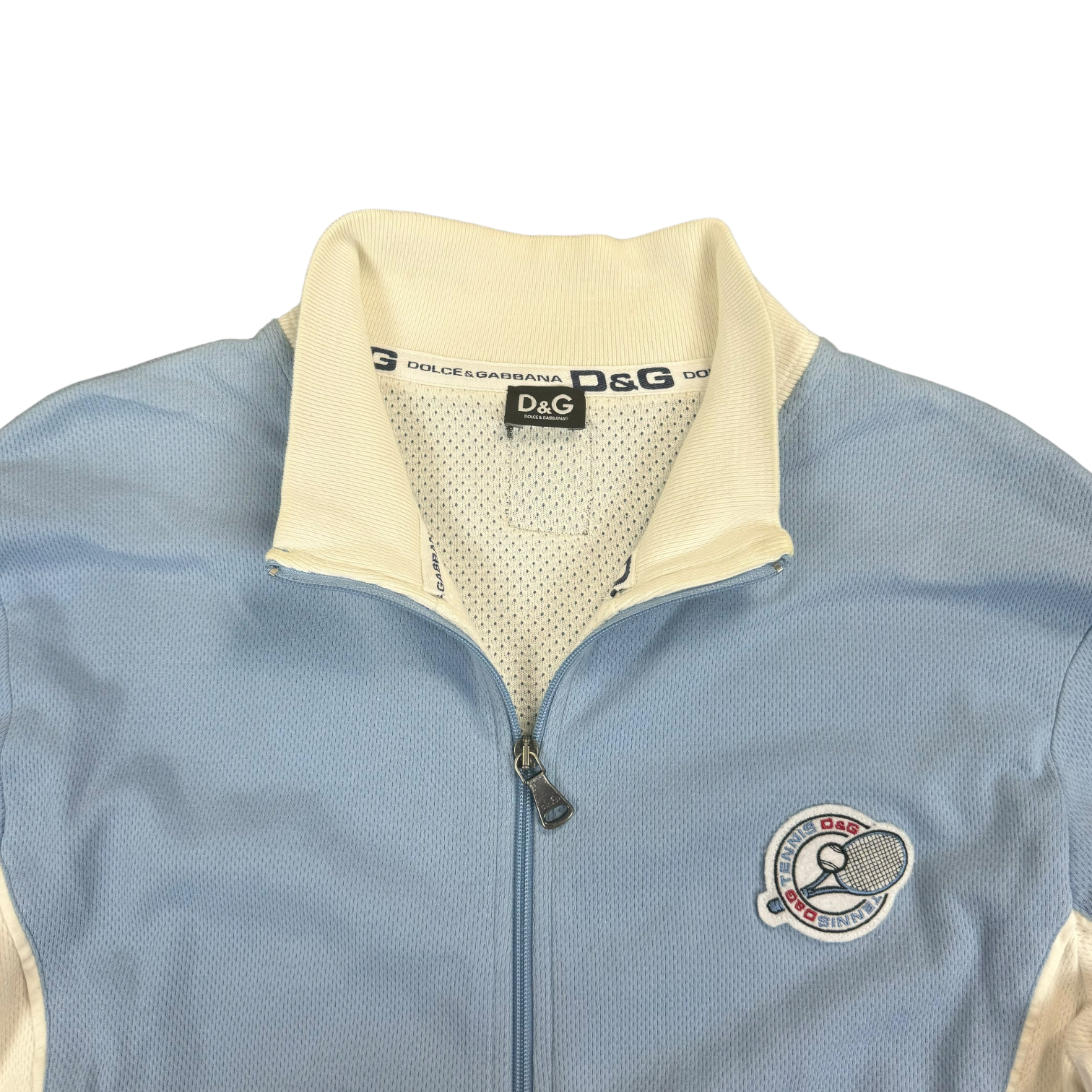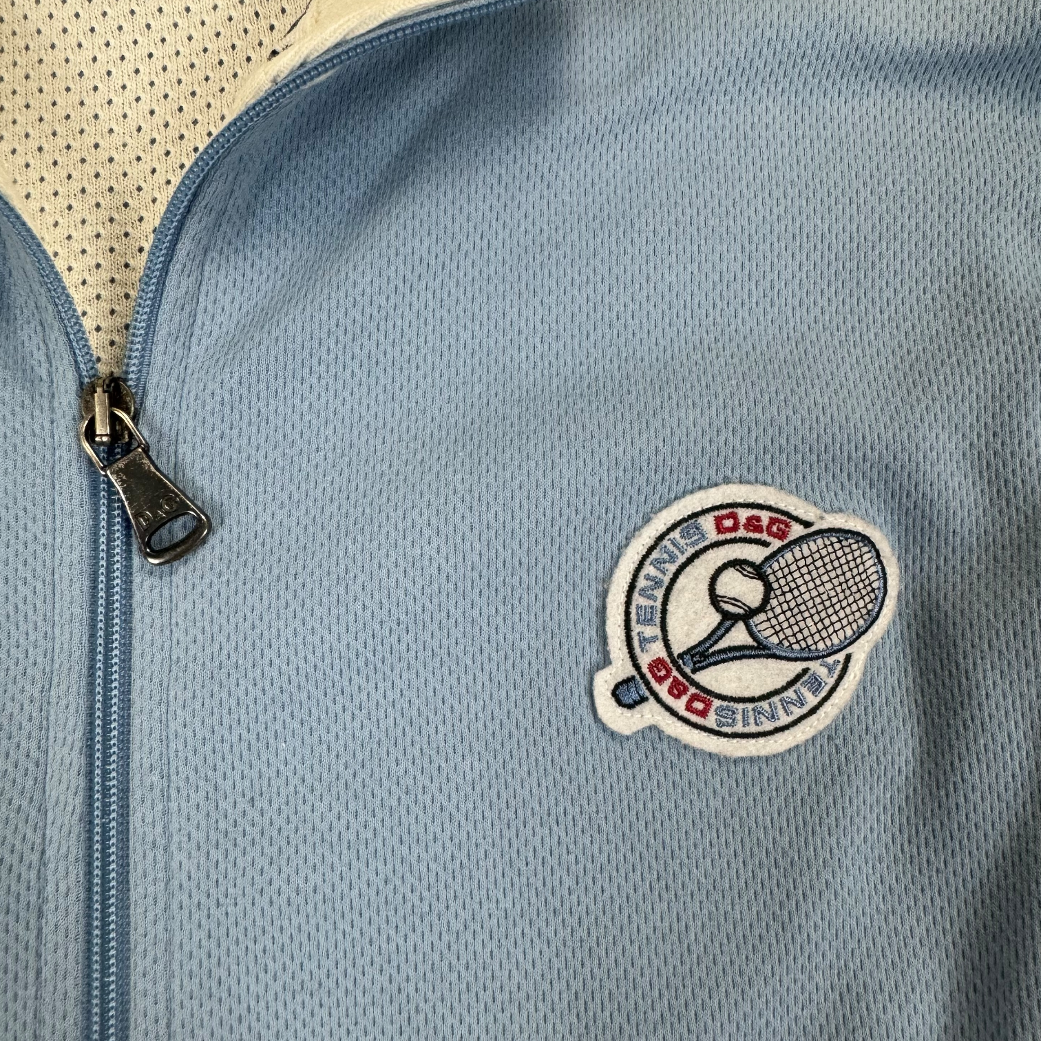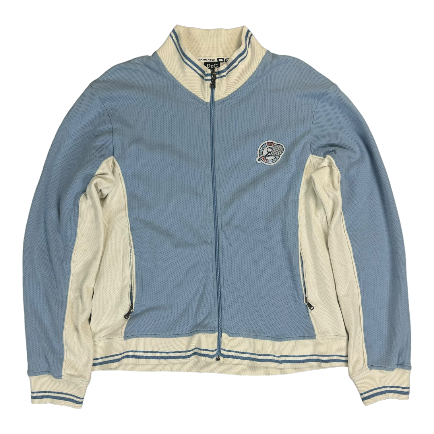 Dolce & Gabbana Tennis Trackjacket in a babyblue colorway. Mesh lined inside, pockets with zippers. Size Xl fits L