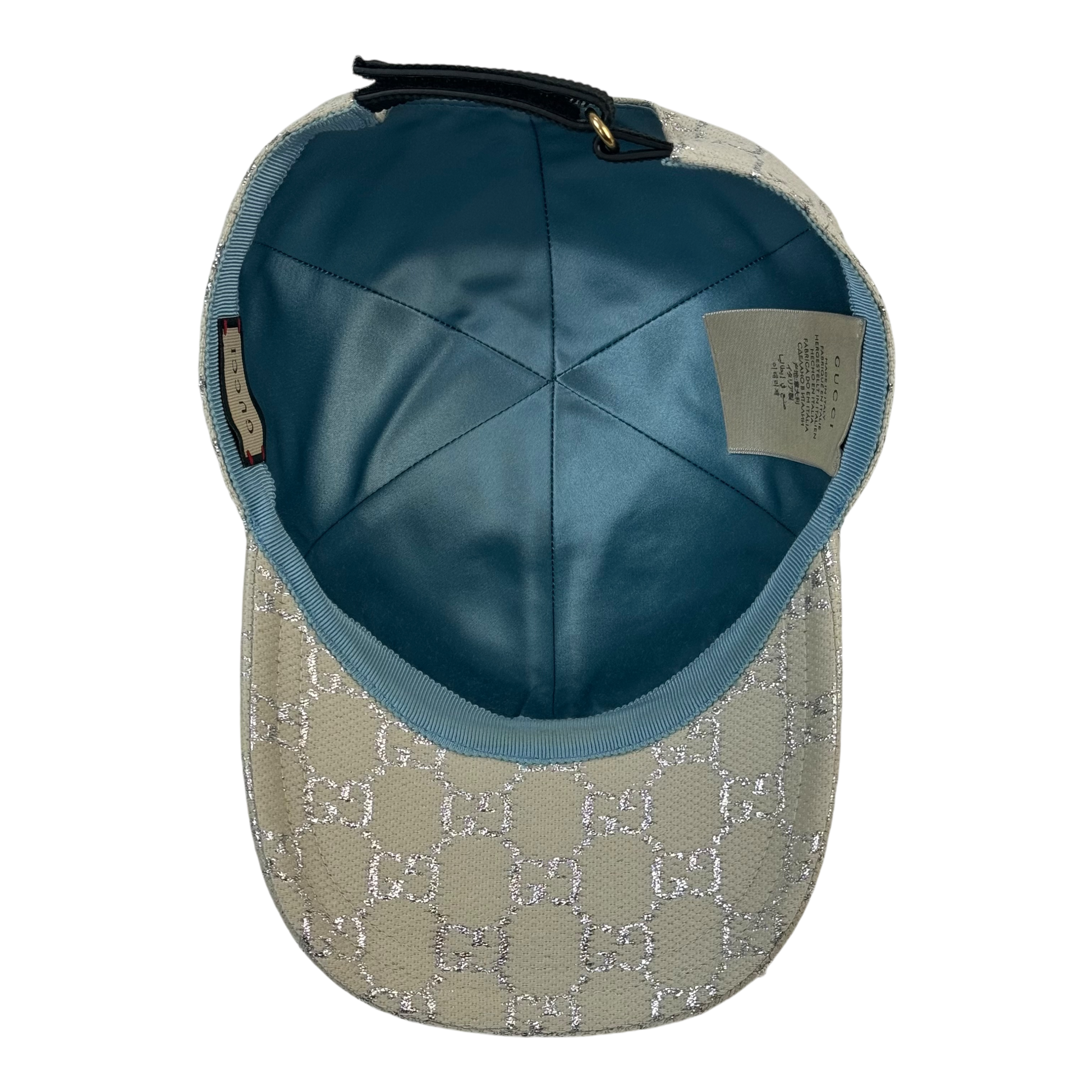 Gucci Monogram cap in a cream and silver colorway. Features a satin lining on the inside, an all over Gucci Monogram print on a classic baseball cap cut.