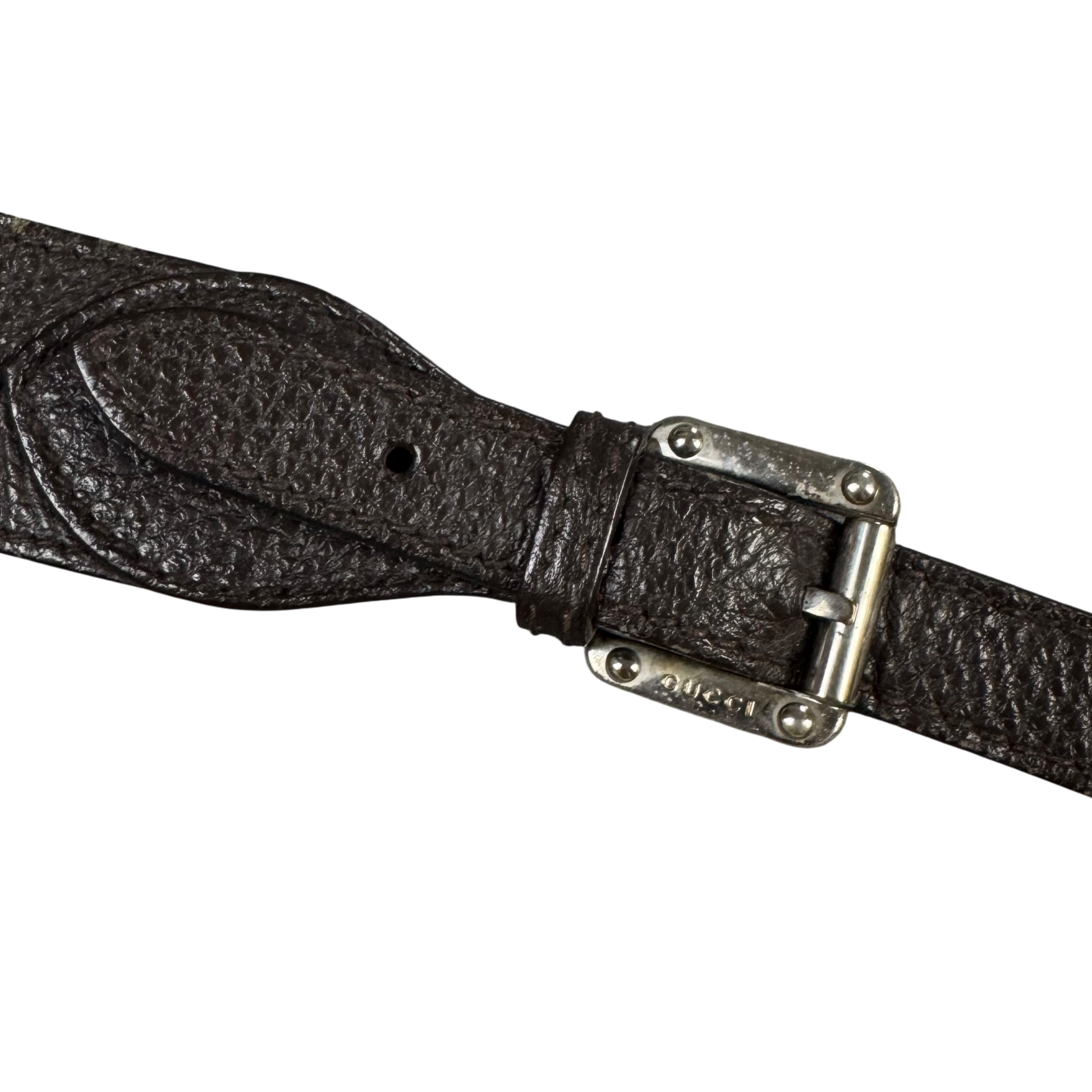 Gucci Sidebag in a dark brown colorway, features a belted strap, all over Gucci Monogram print and 3 additional Interior compartments. Great everyday bag, easily fits an Ipad or other everyday carry items.