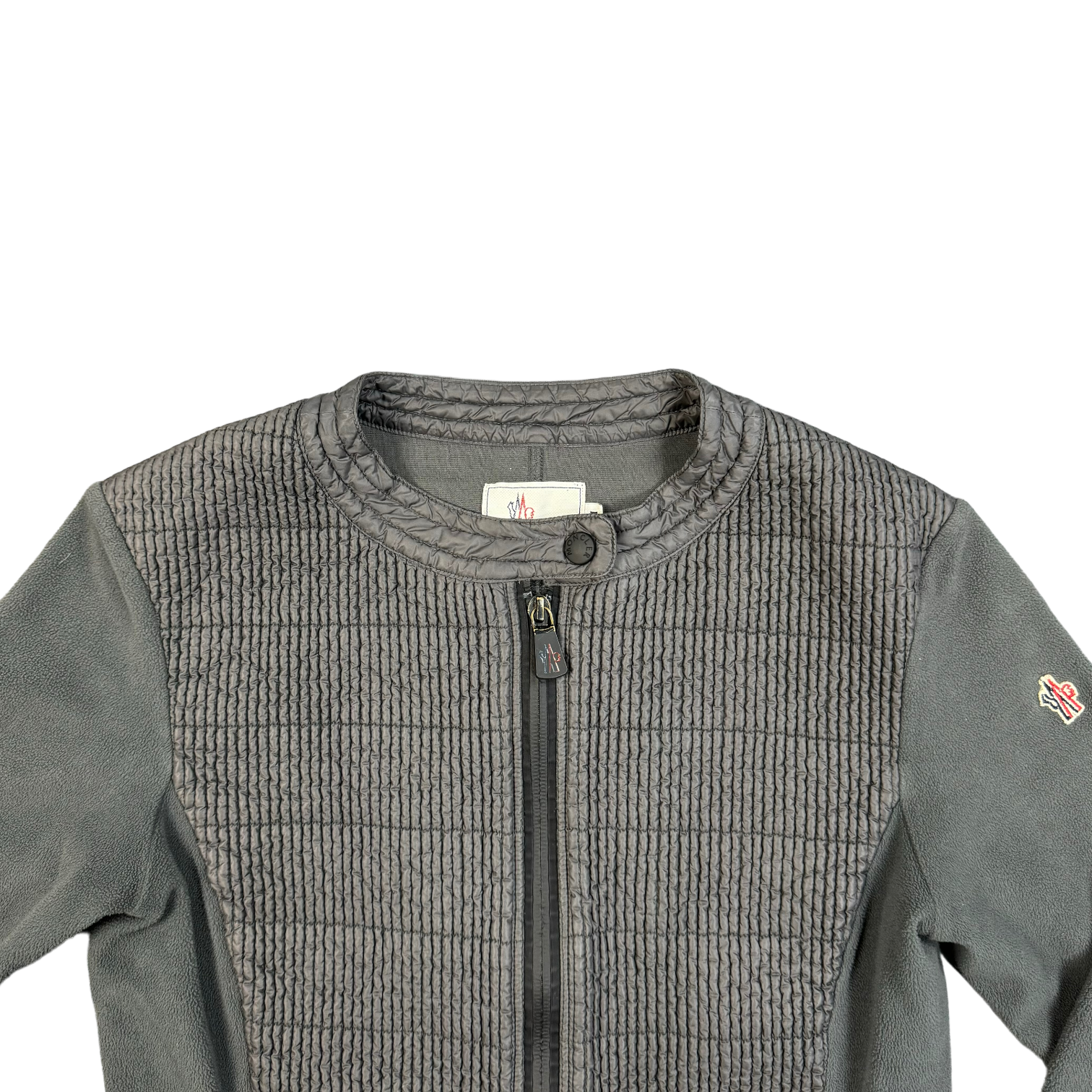 Grey Moncler Zip Up Jacket, fleece material on sleeves, puffer like material on chest. Super warm layering piece for the winter. Womens M, fits Mens S.