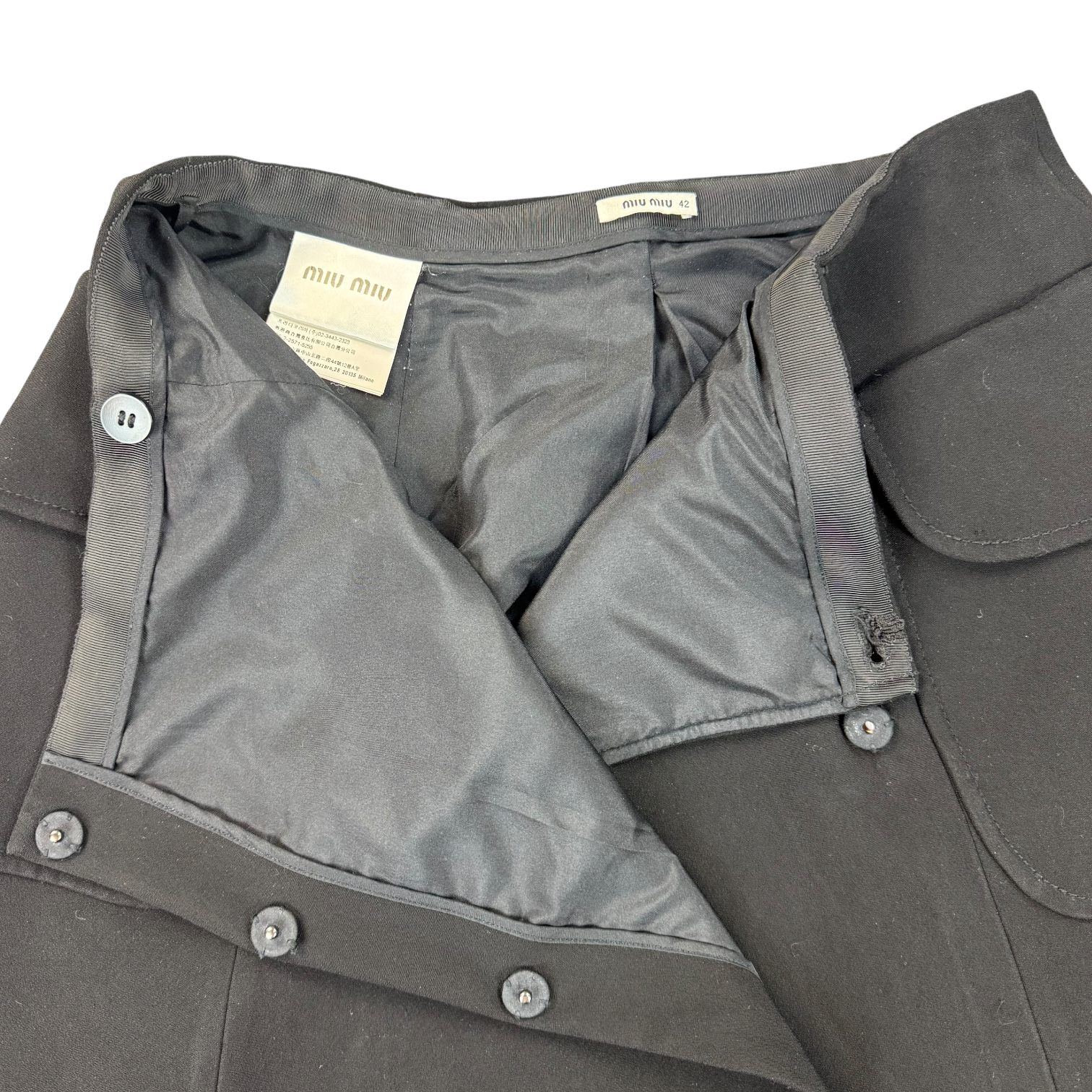 MiuMiu Caroskirt in a black colorway. Features an amazing, asymetric button closure design as well as two big cargo pockets to the side of an otherwise very chic skirt. Size 42, fits like an S-M