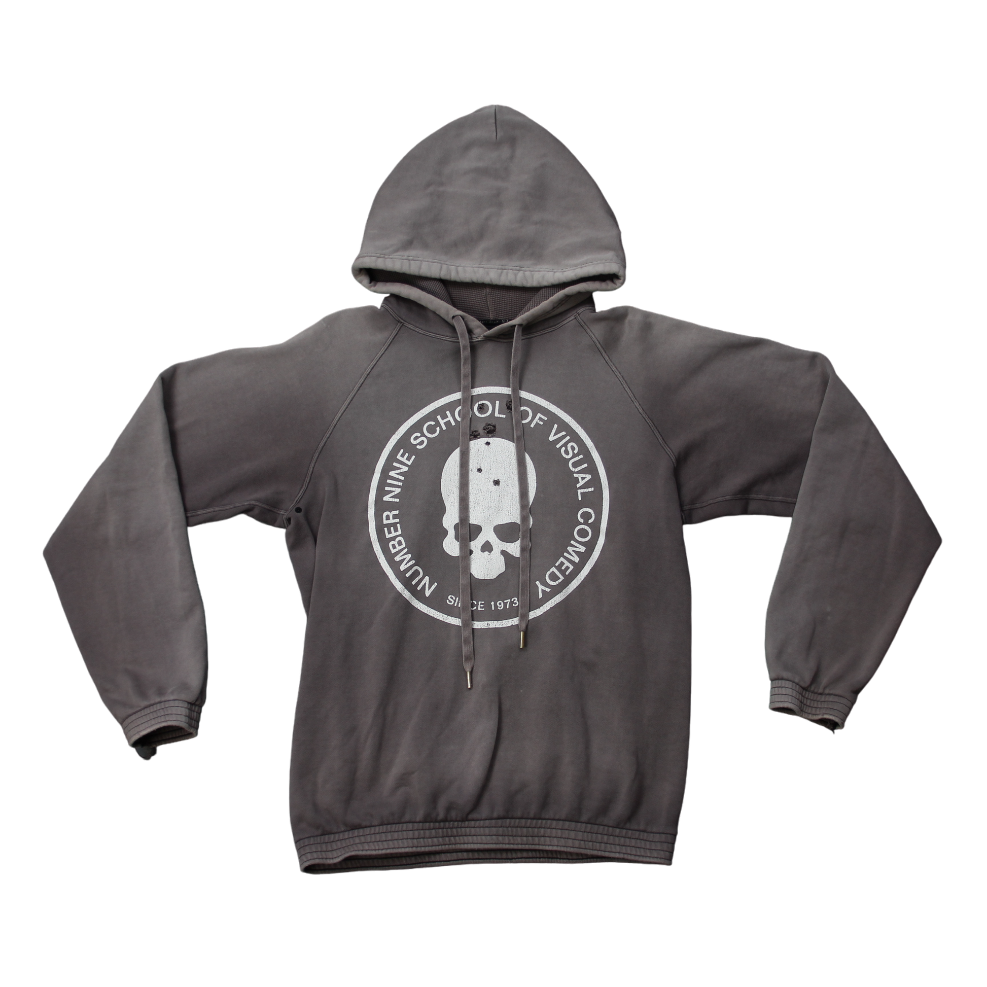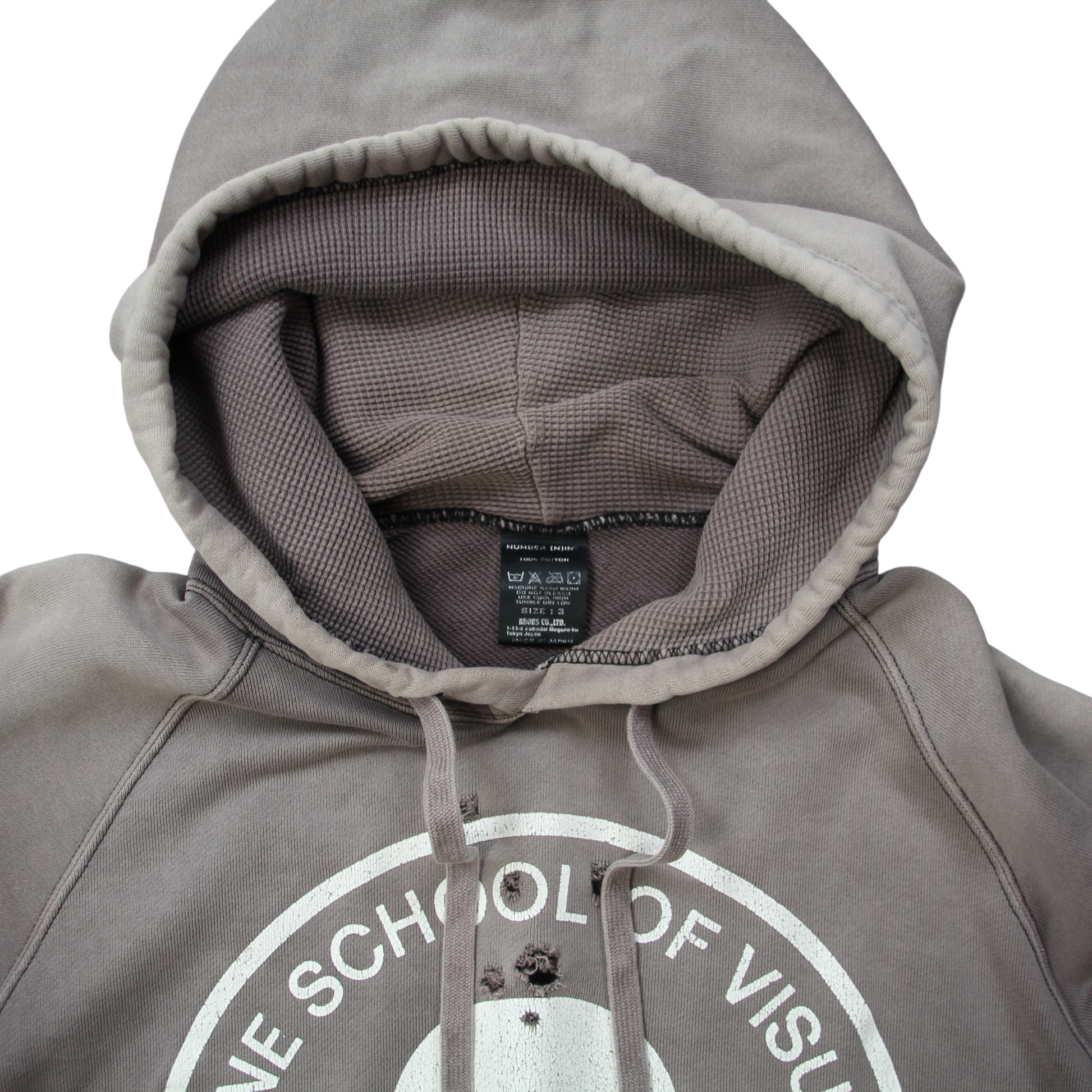 Iconic Number (N)ine School Of Visual Comedy hoodie in a brown that has faded to perfection. This hoodie is thermal lined and features distressing throughout as well as intentional holes to the front and the back of the hoodie.