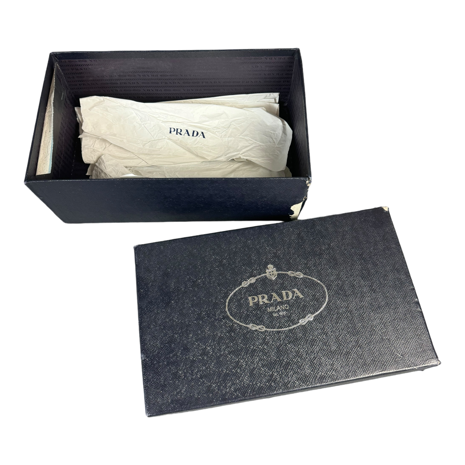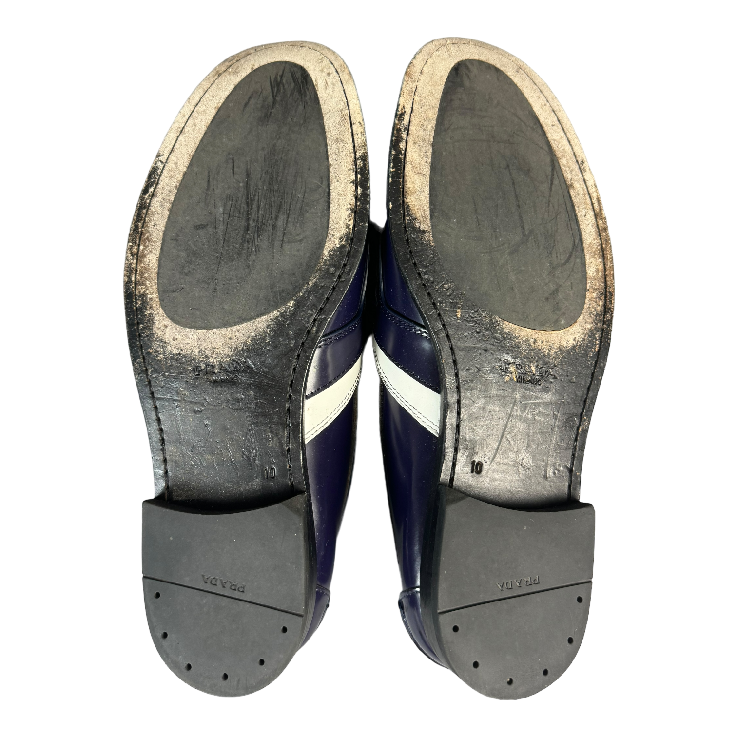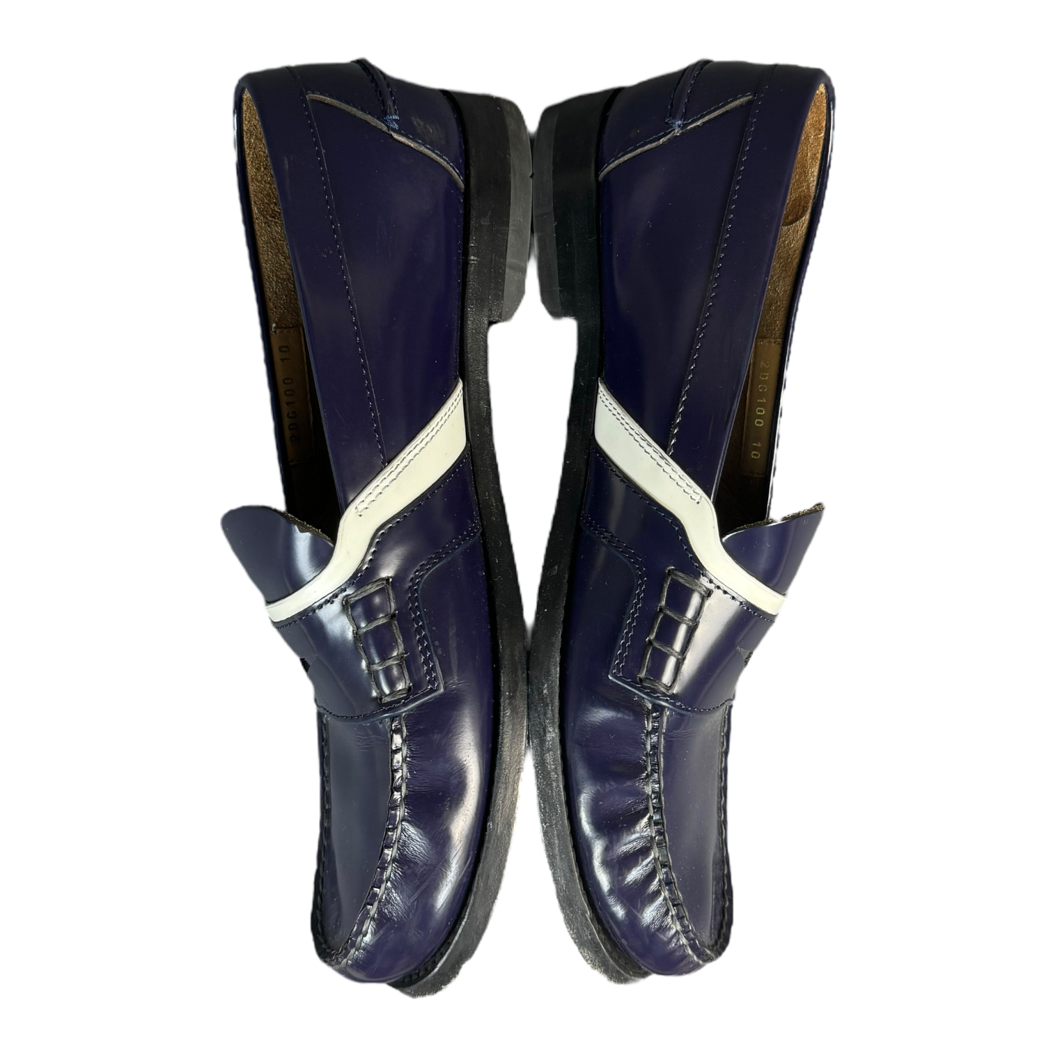 Prada Loafers in a white and navy colorway. Pretty rare, cool shoe, comes with box and wrapping paper.