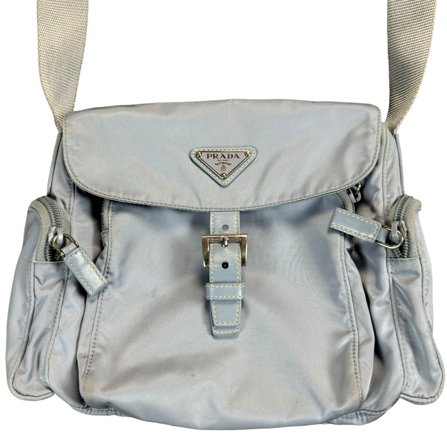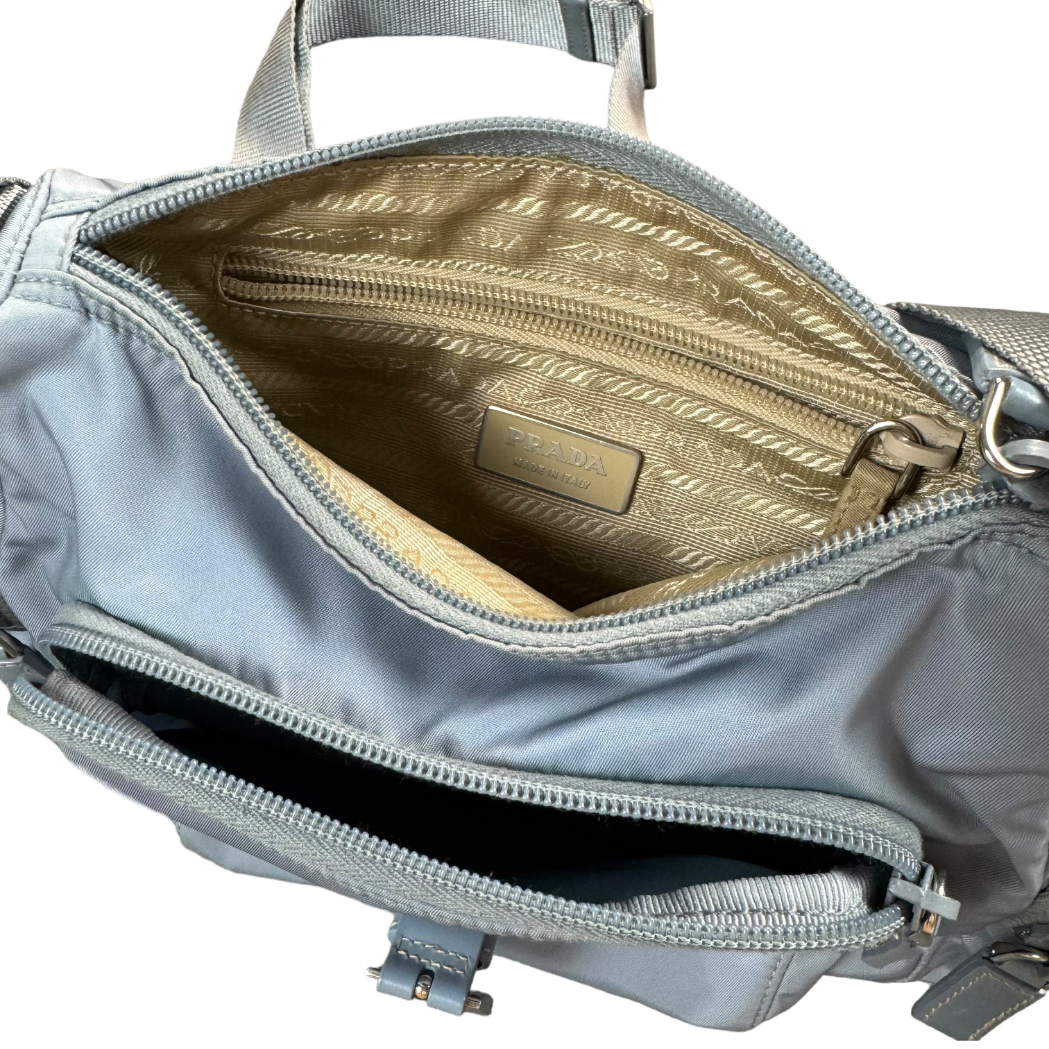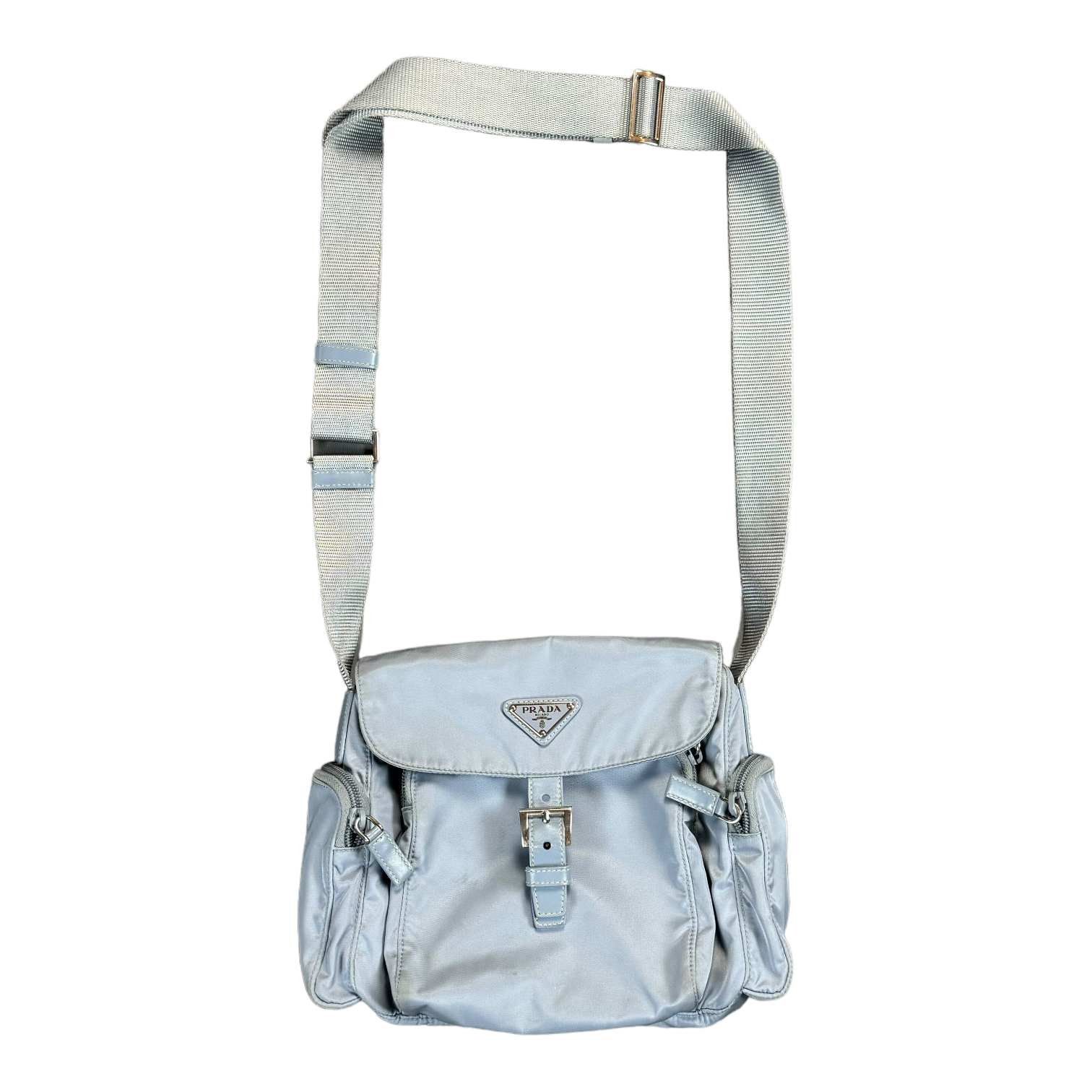 Beautiful all blue Prada sidebag featuring two pockets on the side as well as a blue prada triangle logo. Truly beautiful piece you won’t come across often.