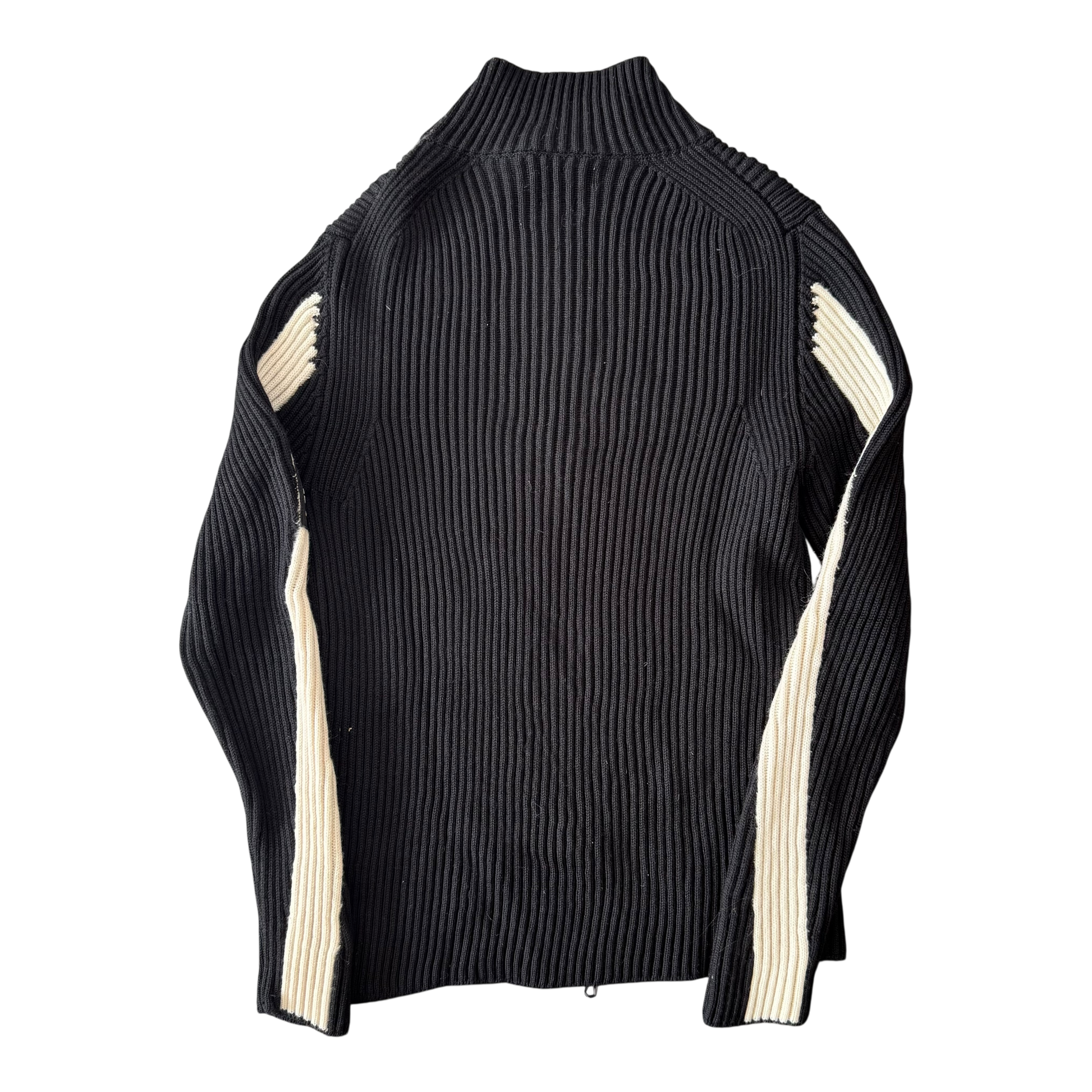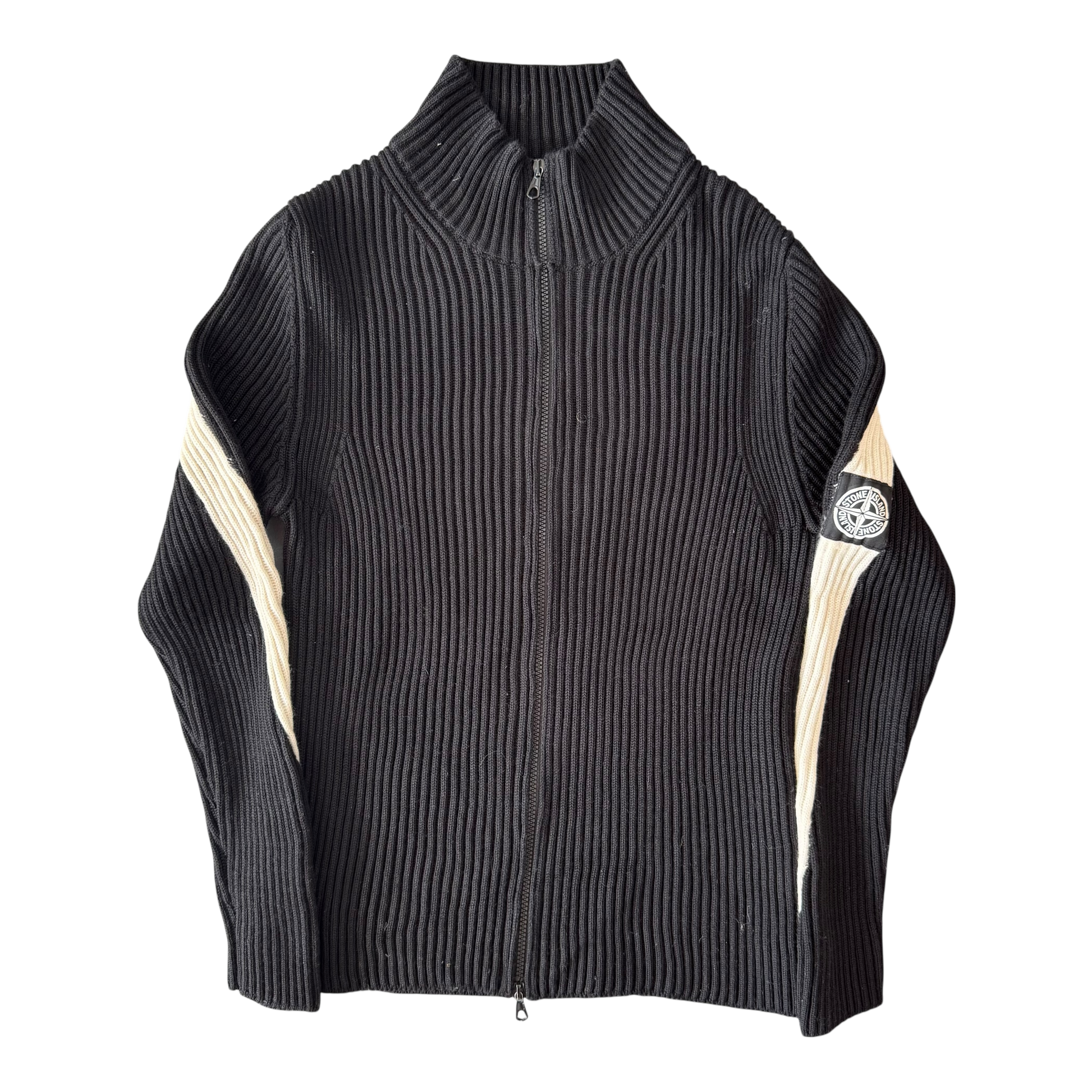 Stone Island Zip-Up Knit Sweater in a white and black colorway. Features the classic Stone Island Patch, and two lines going down the arms. Beautifull, very clean piece from Stone Island, perfekt for winter. Marked a size L, fits more like an S-M